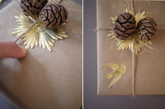 Presents are purchased, gifts are DIY’d, and the only thing left to do is to wrap, wrap, wrap. Beautiful wrapping can be just as special as the gift itself – after all, it sets the deserved anticipation for the wonderful surprise waiting inside, doesn’t it? Today I’ll be showing you how I like to incorporate natural, organic elements atop of brown paper packages tied up with string. Because these are a few of my favorite things . . .